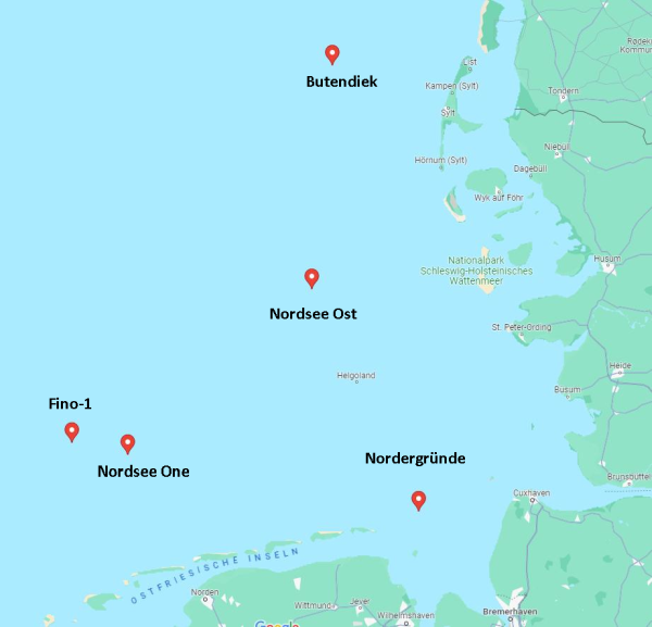 Mir stehen Seegangs- UND Dünungsdaten der fünf auf der Karte verzeichneten Windparks zur Verfügung, die das Wattpaddler Backend den Küstengebieten, je nach Dünungsrichtung, dynamisch alle 30 Minuten zuordnet. Die Wattpaddler App wird hierdurch nicht belastet oder aufgebläht, sie liest nur das Ergebnis in Form einer kurzen Textzeile.
