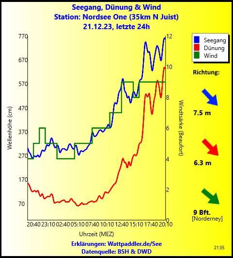 Bei länger anhaltendem, starken Wind aus nordwestlichen Richtungen, baut sich in der Deutschen Bucht eine längere Windsee auf, die die als Faustgröße festgelegte Schwellenperiode zur Dünung von 10 Sekunden überschreitet. Damit wächst der vermeintliche Dünungsanteil des Seegangs in den Wattpaddler Grafiken immer weiter an, obwohl es sich dabei definitionsgemäß immer noch um Windsee handelt. Kenntlich ist das dadurch, dass die Richtung von Seegang und Dünung genau übereinstimmen. Ab einer gewissen Windstärke ist es aber auch egal, ob wir es mit Windsee oder Dünung zu tun haben, es zählt dann nur noch die Windstärke. Denn es ist klar, dass mit Sturmsee nicht zu spaßen ist.