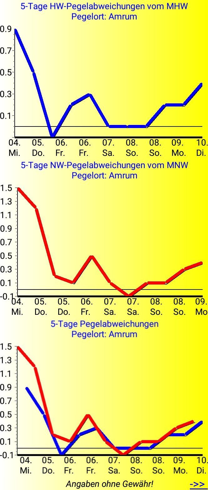 - Auswirkung des Luftdruckes auf den Wasserstand: Eine Erhöhung des Luftdruckes um 10 Hektopascal entspricht einer Senkung des Wasserstandes um 10cm. Selbst an windstillen Tagen kann es somit bei stärkerer Hochdrucklage eine erhebliche Abweichung des Wasserstandes geben!