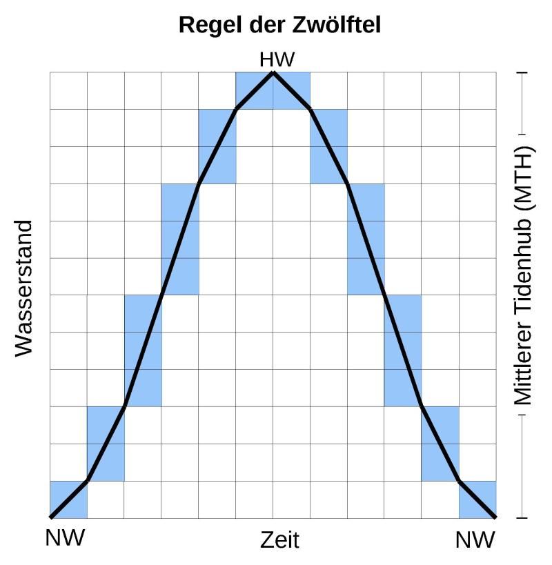 Symbol im Cockpit (nicht bei jedem Ort möglich). Wattpaddler erzielt in mehrfacher Hinsicht genauere Ergebnisse als bei der Verwendung von Mittelwerten (MHW und MTH): Zum einen wird nicht das mittlere Hochwasser (MHW), sondern das genauere astronomische Hochwasser zugrunde gelegt. Dieses enthält bereits Spring- und Nipptidenhöhen. Zum anderen werden für die nächsten 5 Tage die Pegel-Vorhersagen für Hochwasser und Niedrigwasser herangezogen. Dadurch ergibt sich auch eine genauere Bestimmung der Höhe der „Zwölftel“, als durch die Verwendung des mittleren Tidenhubs (MTH). Mit