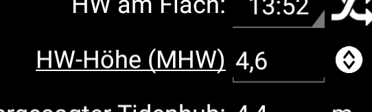 Der Rechenweg kann detailliert angezeigt werden. Um einen Abgleich mit dem manuellen Rechenweg zu ermöglichen, der i. d. R. über das MHW erfolgt, kann durch Tap auf das unterstrichene Label „HW-Höhe(…)“ zwischen der Verwendung der genaueren astronomischen/interpolierten Hochwasserhöhe und MHW gewechselt werden.