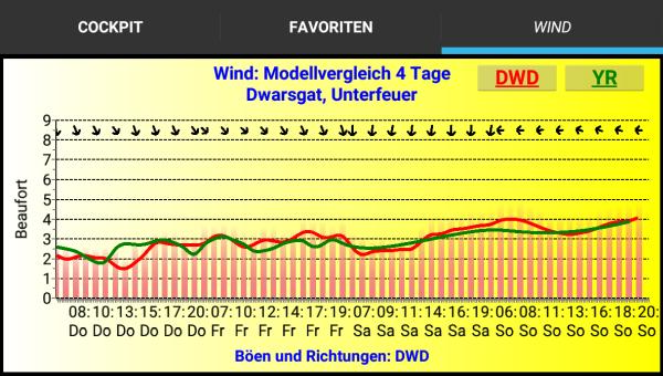 Das aufrufende Wolkensymbol ist dabei doppelt belegt. Durch Tap öffnet sich der Modellvergleich der Windvorhersagen von Deutschem Wetterdienst und YR.no mit Absprungmöglichkeiten in die detaiilierten Vorhersagen der beiden Dienste. Wenn das Symbol nach unten gezogen wird, öffnet sich die DWD Vorhersage direkt. Mehr zur du den beiden besten Vorhersagemodelle für Norddeutschland hier.