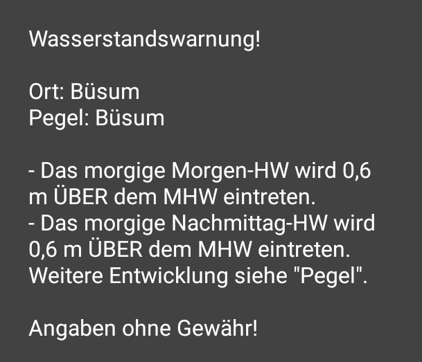 Mit der Einbindung der Wasserstandsvorhersagen kann eine Warnmeldung ab einem einstellbaren Schwellenwert abweichend vom MHW angezeigt werden: