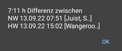 Langstreckenfahrer können mit Tap auf zwei Gezeiten, auch verschiedener Orte, oder auch Sonnenauf- oder Untergangszeiten, deren Zeitdifferenz berechnen: