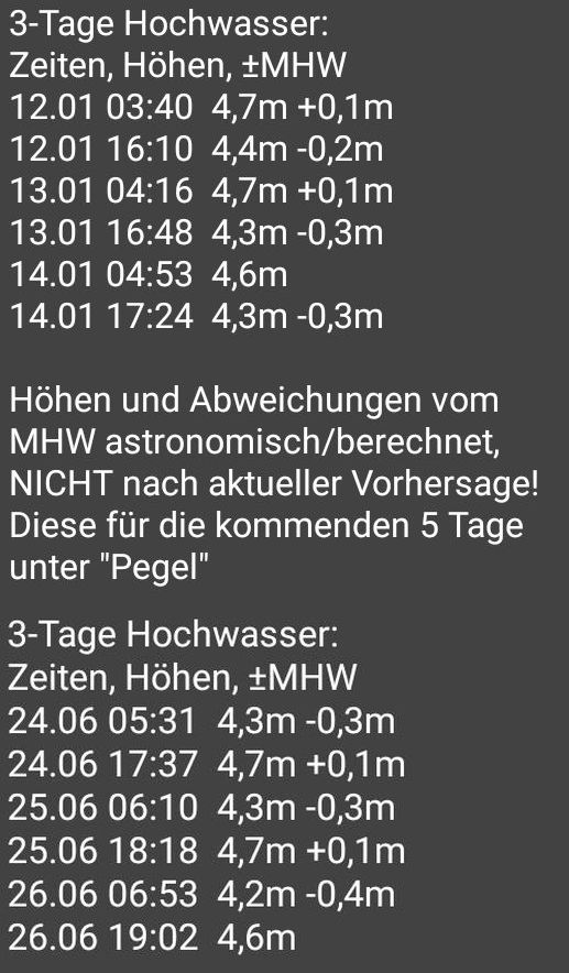 - für kürzere Zeiträume veröffentlicht das BSH genauere Wasserstandsvorhersagen, die auch Wettereinflüsse (Wind und Luftdruck) sowie Pegelstände lokaler Flüsse berücksichtigen. Wattpaddler zeigt die Vorhersagen grafisch im Pegel-Tab, als Abweichungen vom MHW. Bei Tap auf die Grafik werden die jeweiligen Tages Abweichungen vom MHW angezeigt. Diese Werte werden viermal am Tag von einem Hydrologen erstellt und darüber hinaus alle 15 Minuten von einem Algorithmus aktualisiert.