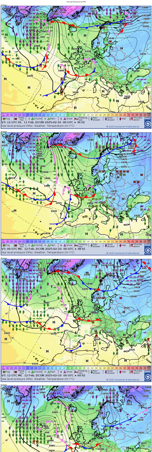 Das „Wetterkarte“ Icon zeigt vier Vorhersage-Wetterkarten des Deutschen Wetterdienstes für die nächsten Tage. Dort sind auf einen Blick Zugbahnen und